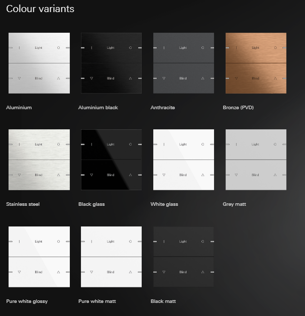 Cảm biến nút bấm Gira 4 có sẵn bằng thủy tinh, thép không gỉ và nhôm. Phiên bản thép không gỉ cũng có sẵn với lớp phủ đồng và phiên bản nhôm có sẵn sơn mài.