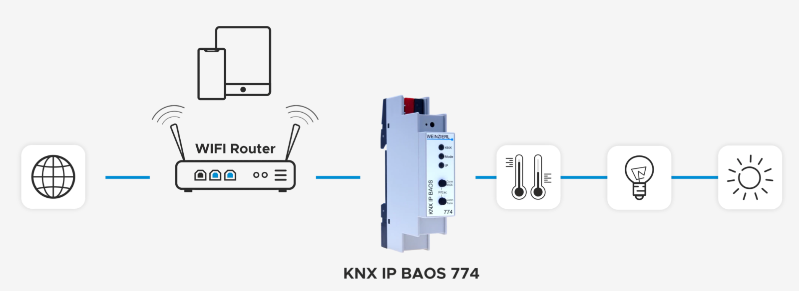 BAOS là từ viết tắt của “Truy cập xe buýt và máy chủ đối tượng”. Có thể kết nối với bus KNX ở mọi nơi qua mạng LAN. Cũng có thể kết nối xe buýt qua internet với KNX IP BAOS 774. Thiết bị hỗ trợ 5 kết nối đường hầm KNXnet/IP đồng thời.