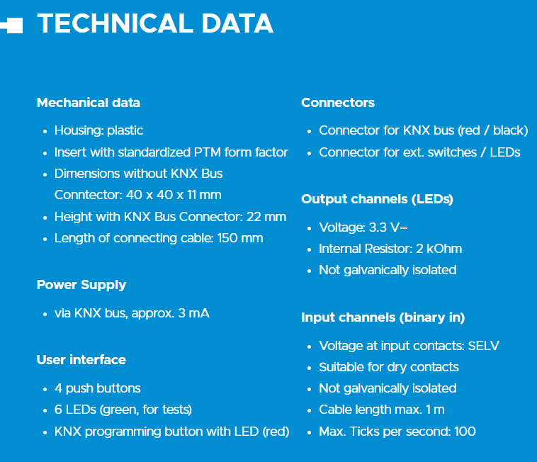 0903238256KNX TP Push Button Interface 420 secure là giao diện nút ấn cho bus KNX. Nó phù hợp làm đầu vào nhị phân để kết nối tối đa bốn nút ấn thông thường hoặc các tiếp điểm không có điện thế. Ngoài ra, thiết bị cung cấp hai đầu ra cho đèn LED. Một cáp kết nối có thể cắm được bao gồm trong phạm vi giao hàng. Các nút ấn và đèn LED tích hợp cho phép kiểm tra nhanh cấu hình.